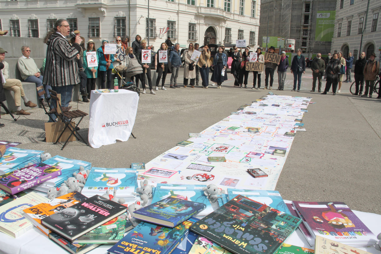 Zum Welttag des Buches lud die vom finanziellen Aus bedrohte größte Leseförderinitiative Buchklub zu einer öffentlichen Aktion vor dem Bundeskanzleramt ein.