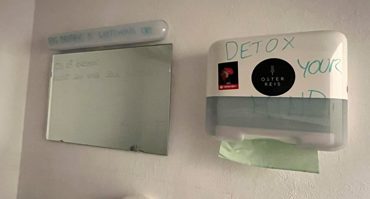 Die allgegenwärtigen Augen starten nicht erst im Bühnenraum, sondern schon im Foyer des Theaters. „Big Brother ist watching you“ (Großer Bruder beobachtet dich), der aus George Orwells dystopischem Roman „1984“ (1948 veröffentlicht) verfolgt dich sogar bis aufs Klo des Theaters Arche (Wien-Mariahilf; 6. Bezirk). Mit aufgeklebten Augenbildern ebenso wie dem einen oder anderen Spruch – bis hin zu „2 + 2 = 5“, das im Roman eine zentrale Figur beim Schachspiel in den Staub des Tisches schreibt.